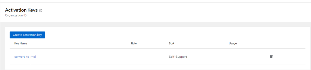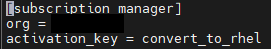 Apuntamos la organization ID y la key y creamos el fichero /etc/convert2rhel.ini con esos datos en nuestra máquina
