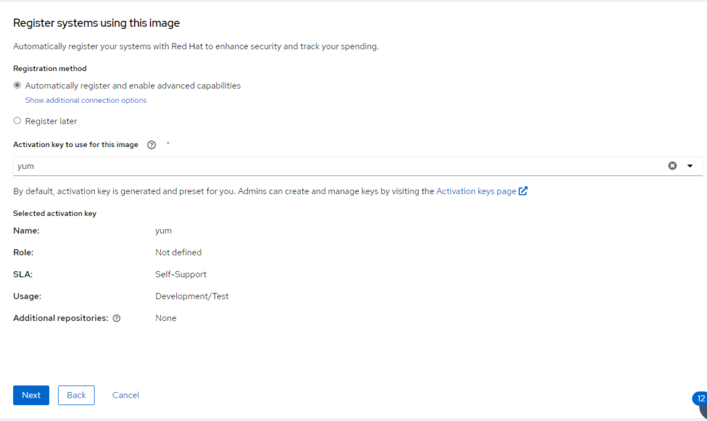 Marcamos Automatically register and enable advanced capabilities y seleccionamos una de las activation key’s que tengamos creadas. Pulsamos en Next