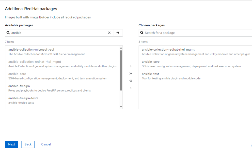 Este paso es opcional. Si queremos añadirle módulos a la imagen, buscamos el paquete o paquetes, en Avaliable packages. Seleccionamos los paquetes y pulsamos en la flecha > para agregarlos. Luego pulsamos en Next