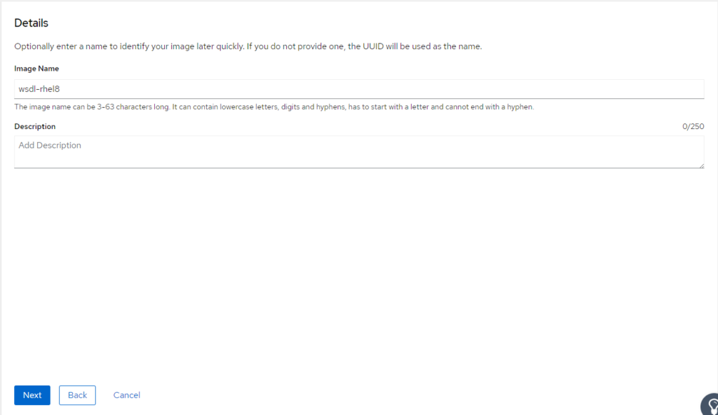 Indicamos el nombre de la imagen / descripción y pulsamos en Next